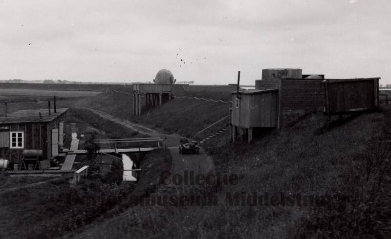 De Scheinwerferstellung 8 op de dijk bij Hatzum waar Erich de leiding had. In het midden is het zoeklicht te zien. Links de woonbarak waar totaal negen man verbleven.