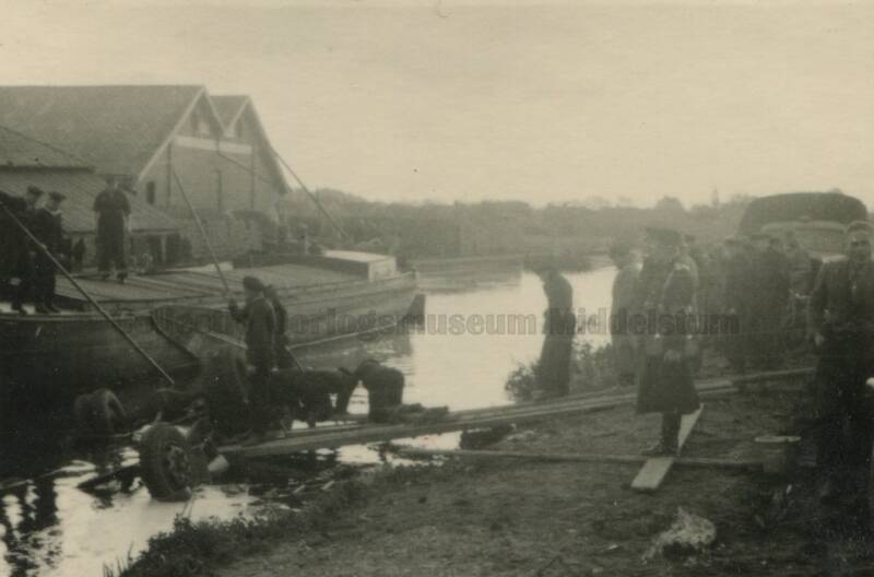 Duitse soldaten proberen Hinrich en zijn compagnon uit de vrachtwagen te redden. Polizei Wachtmeister Bente van de Marine Küstenpolizei kijkt toe. Loods op de achtergrond behoort toe aan steenfabriek De Concurrent.
