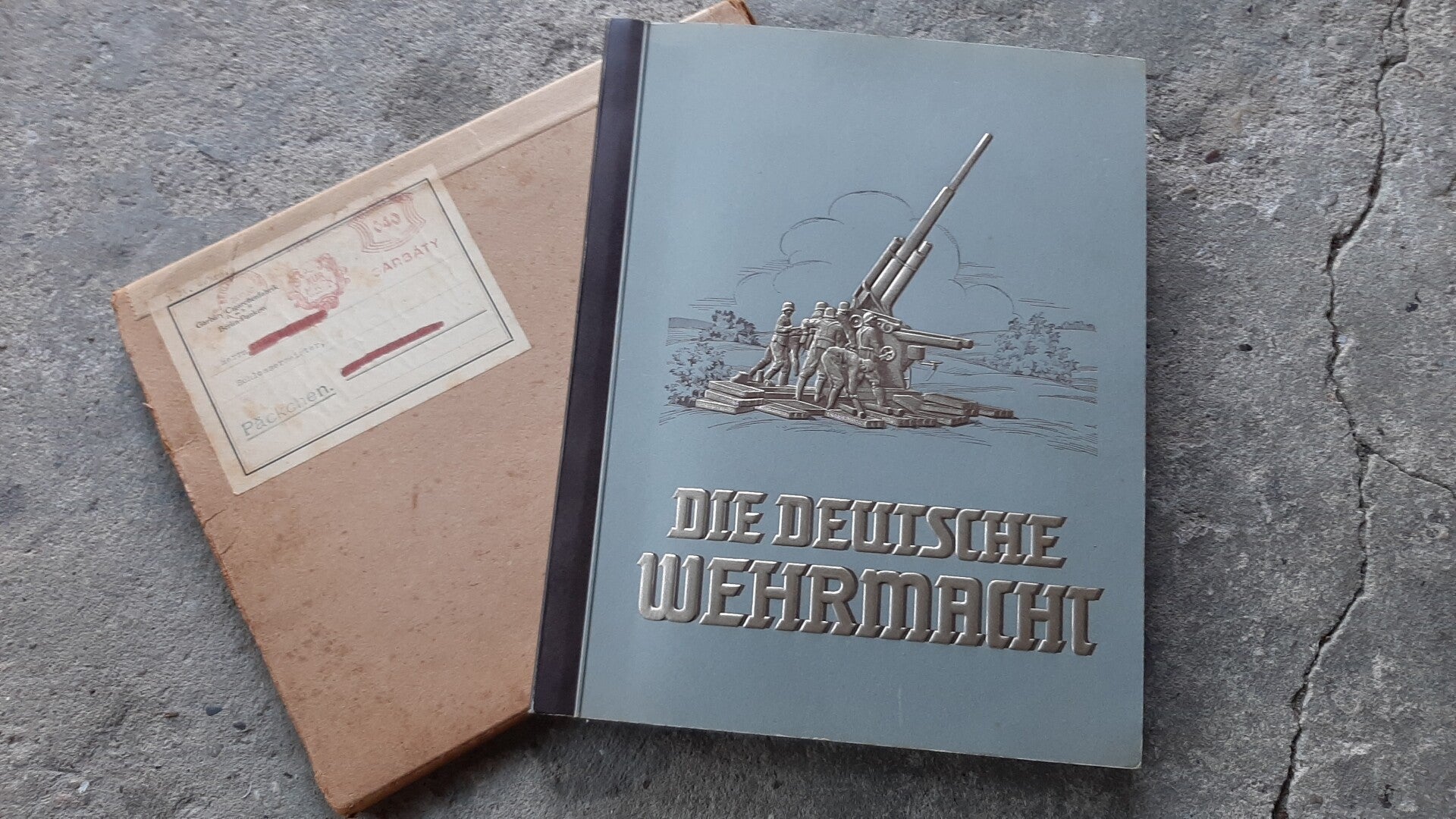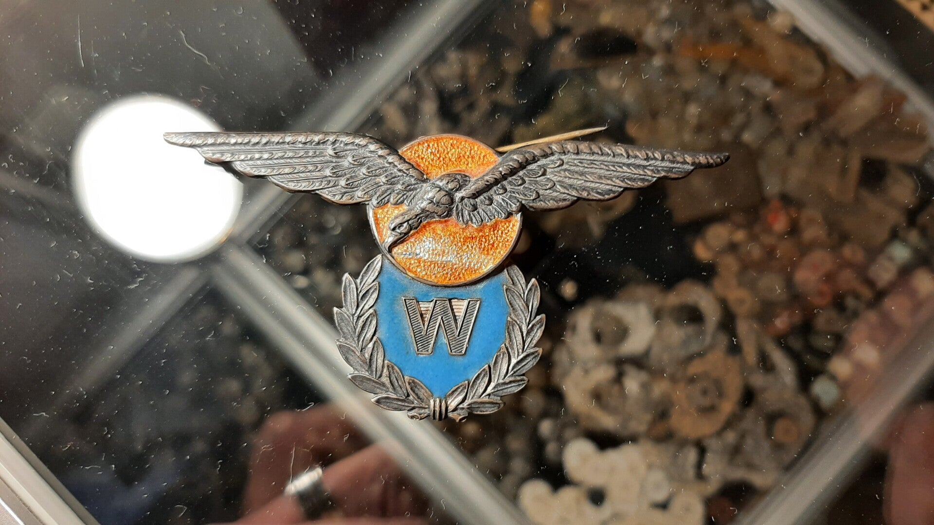 Embleem voor een waarnemer van de Marineluchtvaartdienst, pre-1940Compleet gevuld boek met ‘sigarettenplaatjes’ van het Duitse leger uit de jaren 30Persoonsbewijzen en een oorlogszakboekje van de familie Schrik uit SappemeerPersfoto’s van de Grebbeberg kort na de gevechtenAantal boekjesEen Duitse 6x30 Dienstglas met lederen kokerKarbidlamp van het merk Lucas En tot slot nog een paar Canadese emblemen gekocht