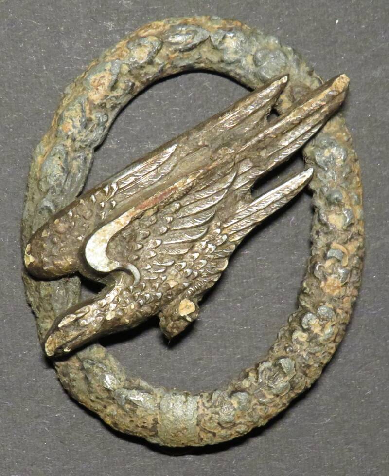 Het werd al ietwat schemerig toen ik het kluitje voorzichtig afbrokkelde tot het metalen object zichtbaar werd: een lauwerenkrans met hierin een adelaar. Dit moest wel een Duitse onderscheiding zijn! Zoveel verstand had ik er toen nog niet van, maar vermoedde dat dit om een parachutisten medaille moest gaan. Snel werd het gat dichtgegooid, legde de grasplag er weer netjes over, trapte het aan en rende naar huis. Daar spoelde ik vol enthousiasme de onderscheiding schoon en een mooie goudkleurige adelaar werd zichtbaar. Een zoektocht op internet bevestigde mijn vermoedens: het ging inderdaad om een Fallschirmschützen Abzeichen. Enkel het hakenkruis ontbrak uit de poten van de adelaar. Een dag later nog geprobeerd deze te vinden, maar helaas..